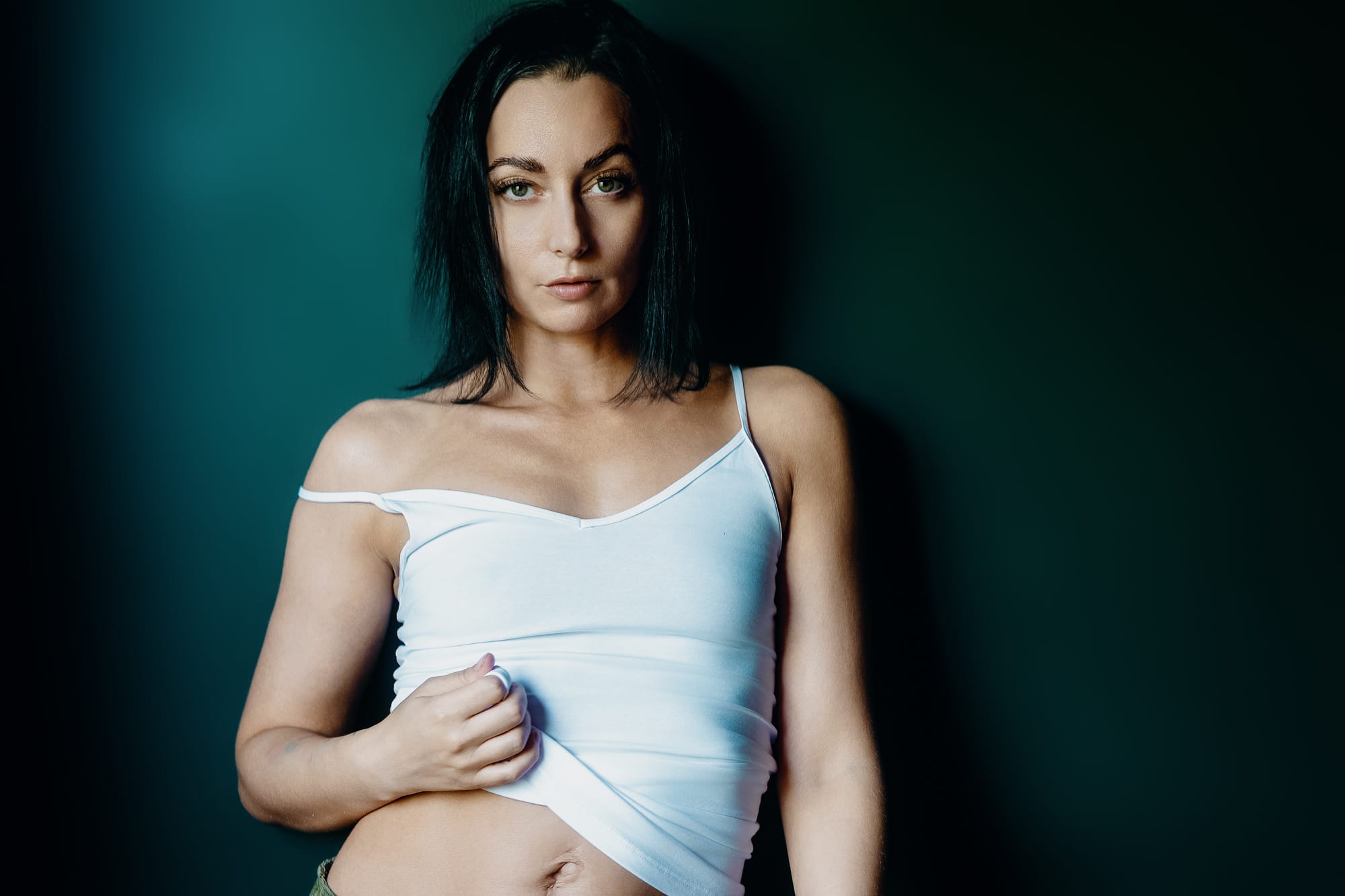 We met at her place, and quickly got to work catching up on the years that had passed. We shot this look in a 3 foot wide patch of bedroom wall. A window to the left created this lovely muted light and Marie got to work working it like she does so well!