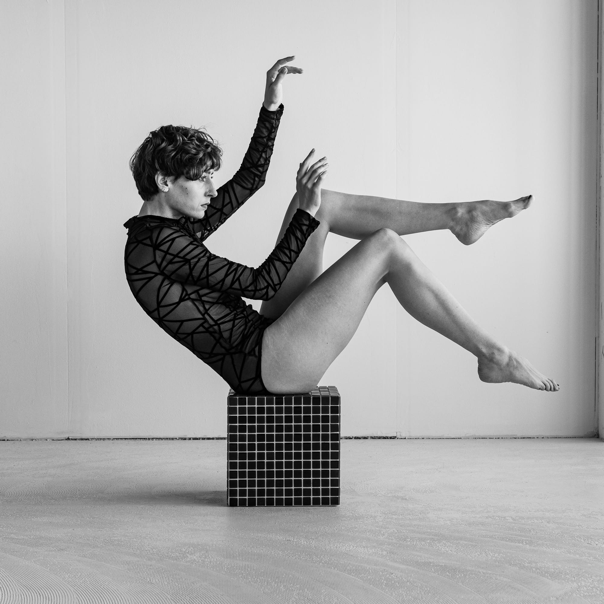 Today's look precedes that one and Emma Helena decided to pair her sheer patterned body with the smaller black tiled cube.